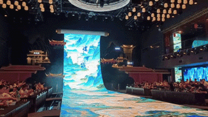 以曲面屏幕展现盛唐宫殿、芙蓉水影及百邦来朝的宏伟场景,结合环绕音效与舞台表演,给食客就餐当中营造沉浸式的视觉与听觉体验。